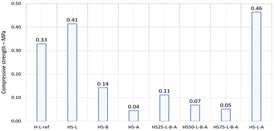 Figure 11 shows the compressive strength results for the mixtures. Considering the reference situation (HL-ref), one can observe that there is no loss in the mechanical resistance only with two mixtures, HS-L and HS-L-A. Furthermore, they provide an improvement in the performance of the mixtures, highlighting the pozzolanic efficiency of the SBA addition in this type of composite. In these mixtures, the HS-L mixture reached 0.41 MPa, almost 25% more than the HL-ref, 0.33 MPa. For the HS-L-A, the increase in the compressive resistance is higher than the HS-L. The HS-L-A mixture reaches 0.46 MPa, almost 39.39% than the HL-ref. It is important to note that there was a reduction of 25% in the hydrated lime used in the last case, HS-L-A, since this percentage was replaced by SCBA (while in the HS-L the binder is only the hydrated lime). The reduction in the hydrated lime content is an important achievement since it promotes a more sustainable material.