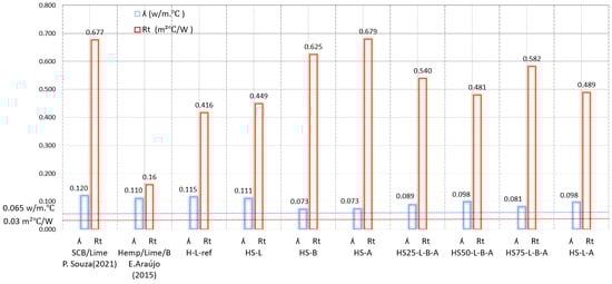 The comparison of the results between the mixtures shows that the mixtures, based on pozzolans, have the lowest thermal conductivities, confirming the results of Abdellatef’s study [54] that added 10% crushed brick to the hempcrete and had the lowest thermal conductivity. As can be seen in Figure 5, the HS25-L-B-A, HS50-L-B-A, and HS75-L-B-A mixtures presented values very close to each other, 0.089 W/m °C on average, while the mixture based only on lime and SCBA was closer to the values obtained for the H-L-ref and HS-L mixtures, around 0.11 W/m °C, whose results were compatible with those found in the literature, between 0.06 and 0.14 W/m °C [54].