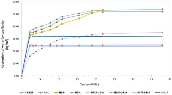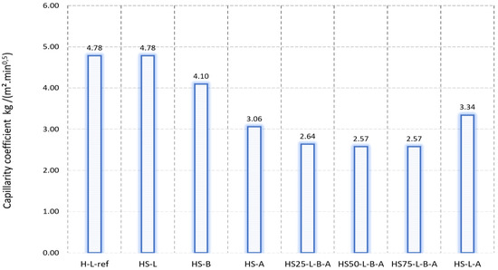 Figure 14 shows the capillary water absorption coefficients of the mixtures studied. It was observed that the lime-based mixes without pozzolan materials presented the closest coefficients, with an average of 4.78 kg/(m2 h0.5). In the mixes that were based on the three and two binders, the absorption coefficient decreased by 45.73% when the three binders studied were mixed and only around 30% with the SCBA mixes (HS-A and HS-L-A), with respect to the lime-based mixes.