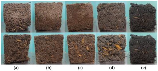 In the mixtures where there was no hydrated lime as binder, HS-B and HS-A, there was a sharp drop in the compressive strength, which, in a certain way, was already expected since pozzolanic materials were effectively efficient when combined with calcium hydroxide [51]. Considering the mixtures that used three different binders (hydrated lime, brick dust, and ash) and aggregates (hemp and SCB) divided in different ratios (with 25, 50, and 75% of SCB), it could be seen that the higher the addition of SCB the lower the resistance. In addition, the compressive strength was unsatisfactory, varying between 0.05 and 0.11 MPa. Figure 12 shows the state of the test specimens after the application of the compression test.