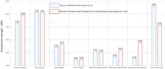 In the salt exposure tests, which were evaluated under the same conditions in both studies, Walker et al. (2014) [6] mixtures gained better compressive strengths in some compositions and to a lesser extent in mixtures with SCBA. In this case, as we are comparing as the HS-L-A mixture in this test, it did not perform well and presented a loss of 31.66%. In Walker et al. (2014) [6] study, it gained 16.21% performance, and it is an area for further research to check for a trend.