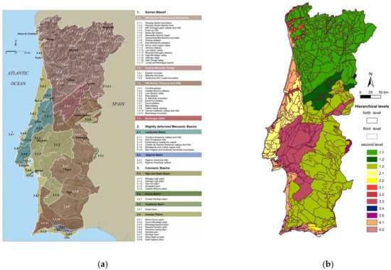 Geomorphological units of mainland Portugal: three-level geomorphological units [67] (a); map developed in the present work, by detailing and reorganizing the previous version, displaying four-level geomorphological units, at a 1:500,000 scale (b).