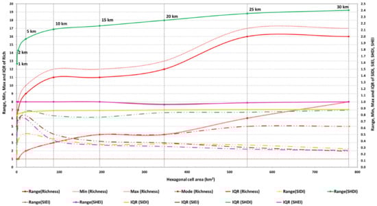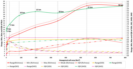 Maximum values (represented by range) from evenness indices (SIEI and SHEI) do not vary with the increase in cell size, nor with the increase in richness. Maximum value from SIDI progresses slightly in the first cell sizes (1 km–10 km) and even more softly in the following cell sizes (15 km–30 km). Maximum value from SHDI evolves in a clearer way with the increase in cell size, revealing a strong influence of richness, progressing slightly faster between the cell sizes of 1 km and 10 km than between the cell sizes of 15 km to 30 km. Maximum values from diversity indices do not provide any relevant information for the optimal cell size(s) selection, per se, although the distinct rates of increase, particularly observed in SHDI, combined with other parameters could give some insight in this regard.