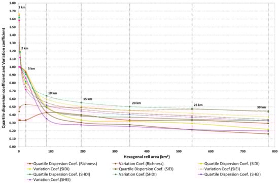 The quartile coefficient of dispersion and the coefficient of variation of richness present an overall smooth evolution along cell sizes, performed within a small range of values, especially when compared with the evenness and diversity indices, clearly showing smaller dispersion values within the first cell sizes (Figure 4). The coefficient of variation increases between cell sizes of 1 km and 5 km, from the lowest value (0.44) to the highest value (0.53), slightly decreasing from there, maintaining dispersion values above the lowest value observed at a 1 km grid size. This clearly reflects the presence of large maximum outliers between cell sizes of 1 km and 5 km. The quartile coefficient of dispersion, being more robust, is almost invariable until a cell size of 5 km (0.33), slightly increasing in a cell size of 10 km (0.43), and slowly decreasing from that point until a cell size of 30 km (0.29).