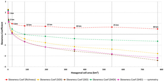 The skewness coefficients from richness, SIDI, SIEI, SHDI and SHEI exhibit very analogous evolution, presenting highly positively asymmetrical in the first two cell sizes, decreasing with the increase in cell size, sharply until a cell size of 5 km, and more smoothly from then onwards, displaying very distinct values of symmetry (Figure 8). As previously noted, the closeness to symmetry, or the absence of extreme asymmetry indicated by the skewness coefficient, can help to support the optimal cell size(s) selection.