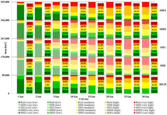 Regarding the lithological diversity dataset (Figure 9), the distribution of areas through the five classes become more even in the 5 km cell size, particularly for the evenness and diversity indices, although richness presents a quite even distribution of areas through the first four classes (very low to high), and a residual presence of the “very high” class (4%). The “medium” to “very high” diversity classes become dominant from cell sizes of 5 km for SHEI, SIEI and SIDI; in cell sizes of 10 km for SHDI; and in cell sizes of 15 km for richness. From that point on, with the increase in cell size, the distribution of area between the five classes becomes progressively more uneven, and the lower classes become residuals, leading to a smoother map, mainly characterized by three classes. From a cell size of 15 km onward, the “very low” class represents less than 12% for both diversity indices and less than 10% for both evenness indices, being quite residual (less than 5%) in the case of richness.