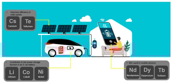 Examples of the use of some critical elements in green technology (electric car batteries, solar panels) and high-tech electronics (i.e., smartphone batteries, magnets, and screens). The examples above include numerous other critical elements not shown that are essential to their various technologies (e.g., electric vehicles).