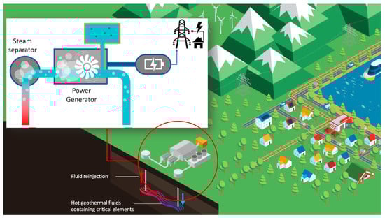 Cartoon highlighting the co-existence of geothermal energy production and critical element extraction from geothermal fluids (i.e., lithium).