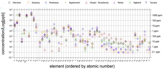 The concentration of minor and trace elements in New Zealand’s geothermal fluids ranges from <1 ppt (ng L−1) up to several ppm, depending on the element. Figure 4 plots the highest published concentrations for each of the measured elements in New Zealand’s geothermal fluids (Wairakei, Kawarau, Rotokawa, Mokai, Ohaaki–Broadlands, Ngāwhā, Ngatamariki, and Tauhara) ordered by atomic number (see Table 2 for the range in concentrations and references therein). The data for most of the trace elements should be considered only as qualitative, and some concentrations are close to detection limits (see Table 2).