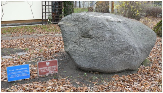 Large erratic boulders recorded in Poland are subject to geoconservation and are protected by law [38] as monuments of abiotic nature. Therefore, the largest (860 m3) boulder in Poland, Trygław in Tychów in Central Pomerania (northern Poland), is of conservational importance. The largest erratic boulder in Pruszków (vol. 4.6 m3), standing next to the Museum of Ancient Mazovian Metallurgy (https://mshm.pl/en/ [accessed on 10 February 2023]; Figure 1), is also of such importance.