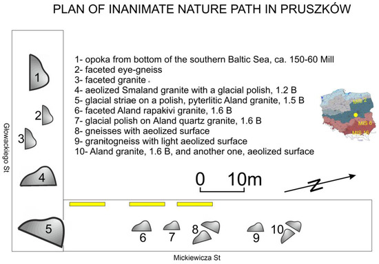 Plan of the geotrail in Pruszków. The location of the city (yellow dot) and main glaciation ranges (MIS16—Cromerian, MIS6—Saalian, MIS2—Weichselian, Last Glacial Maximum) are given on a small map. Source: https://zywaplaneta.pl (accessed on 26 May 2023), changed.