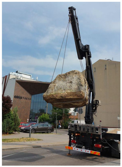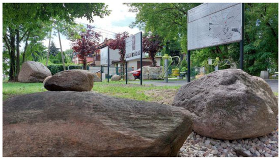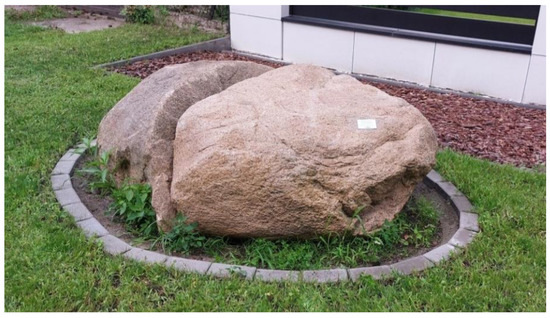 Carefully selected, after a detailed inventory, erratic boulders located within the city limits were transported on 30 June 2022 from their previous locations (Figure 4 and Figure 5) to the geotrail. This is a path along which abiotic objects are arranged, united by a common theme or motif. Such georoutes connect geoobjects of unique geological interest and are suitable for education, research, and tourism activities [56]. According to [57] “the geological routes connect geosites in a sequential and orderly manner to represent a given sector’s geodiversity. These tours are self-guided and designed to know the natural space’s characteristics through a route where stops are established. Materials such as information panels, explanatory brochures, and a guide allow the correct interpretation of the places”. A local company took care of organising the transport and placing the boulders in the new location. Hiring employees from the immediate vicinity supports the sustainable economic development of this region.