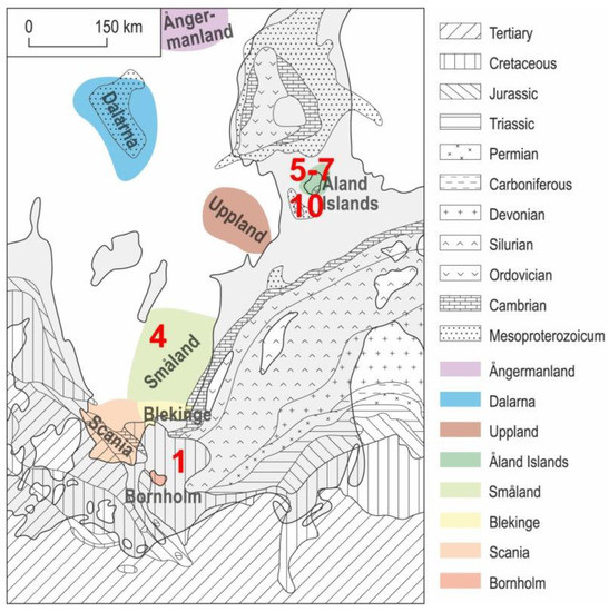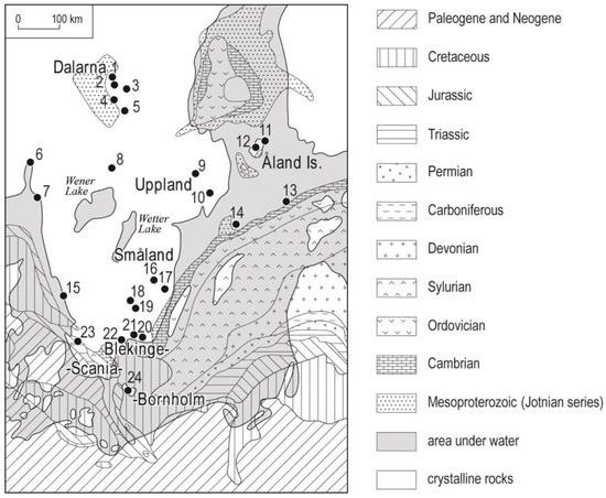 Schematic map of the Scandinavian source areas of selected indicator (dots with numbers, mainly on land) and other (outcrops mainly at the bottom of the Baltic Sea) erratic boulders found in the area of glacial deposition. Explanation of numbers: 1—Bredvad porphyry, 2—Garberg granite, 3—Grönklitt porphyry, 4—Dalarna porphyry, 5—Siljan granite, 6—Oslo porphyry, 7—Bohus granite, 8—Filipstad granite, 9—Uppsala granite, 10—Stockholm granite, 11—Åland granite and Åland rapakivi granite, 12—Åland quartz porphyry, 13—red Baltic porphyry, 14—brown Baltic porphyry, 15—charnockite, 16—Småland granite, 17—Påskallavik porphyry, 18—grey Växjö granite, 19—red Växjö granite, 20—Karlshamn granite, 21—Halen granite, 22—Vånga granite, 23—Scania basalt, 24—granites and gneisses of Bornholm. Source: from author [63] after [39], changed.