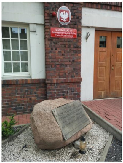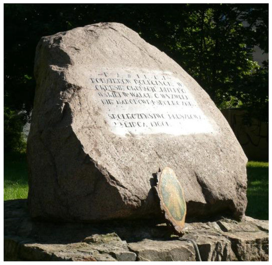 Large rock objects, characterised by an interesting shape or due to their colour, structure, and texture, are highly valued and are therefore often used as monuments or pedestals for displaying commemorative plaques. In such situations, erratic boulders play a cultural and informative role (e.g., [37,58,93,94,95]). There are at least four such erratic boulders in Pruszków: Småland granite (Figure 7), sandstone (Figure 15), Åland rapakivi granite in front of the DULAG 121 Museum (http://dulag121.pl/?lang=en [accessed on 10 February 2023]); (Figure 16), and a microgranite with a pegmatite vein.