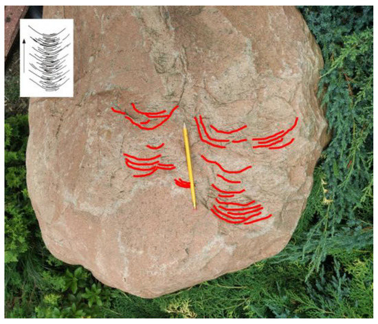 An erratic boulder is of great scientific value if a record of the detersion process, i.e., grinding and smoothing (e.g., scratches, glacial polishes (Figure 7), crescentic furrows (Figure 8), and micro-depressions) can be seen on the boulder’s surface. All of these subglacial processes took place in the sole of an ice sheet at a time when a boulder was still in the source bedrock upon which the Scandinavian ice sheet was moving. This record could also have appeared on the rock’s surface while it was already being subglacially transported. The rock anchored in the foot of the ice sheet then rubs against the ground on which the ice sheet moves. Such microforms can be identified on several erratic boulders found in the city, e.g., in front of the Complex of General and Sports Schools in Pruszków, next to the church in the city centre (Figure 8), and on one of the boulders of the newly created geotrail in northern Pruszków.