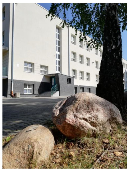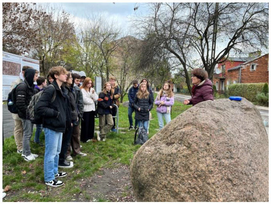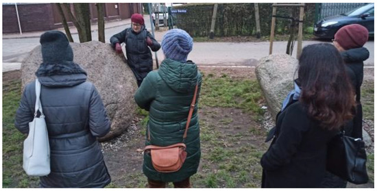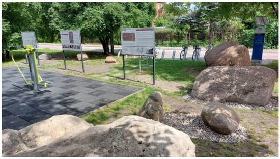 The presence of rocks of different origins, sizes, or colours in one place—in the immediate vicinity of the school (e.g., in front of Primary School No. 6 in Pruszków; Figure 11)—means that the lapidarium has great potential as an educational function to be fulfilled. This depends on the involvement of local teachers, not only in geography [85] or science, but also in mathematics, languages, and arts. The core curriculum obliges a teacher to conduct classes in the field [86]. It is worth ensuring that schoolchildren take part in annual events popularising earth sciences, such as Earth Day (21 April), Geodiversity Day (6 November), and International Geomorphology Week (1st week of March) as celebrated in Poland. These events can be organised in the lapidarium area provided that access to the collection is easy, that it is equipped with boards with accessible information, and that it is characterised by proper quasi-touristic developments expected by the recipients (e.g., identification labels on rock specimens, baskets for garbage, places to rest). It is important to have a geo-interpreter who will sensitise students, as well as the non-specialized general public, to the beauty of abiotic nature in an interesting and skilful way (e.g., [2,3,50,85,86,87,88,89,90,91,92]).