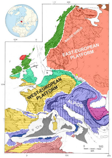 Schematic geological map of Europe. The yellow dot marks the location of Pruszków. The location of Poland and the area of a bigger map are given in the left upper corner.