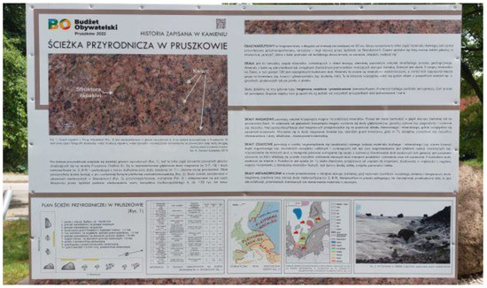 The collection of erratic boulders is complemented by three large, colorful, double-sided information boards presenting interpretative content in a way that is accessible to a layman (e.g., [96]). They have a similar layout and coherent editorial layer in common. Information boards present the following issues: “History written in stone” (Figure 22), “The importance of erratic boulders in Pruszków” (Figure 23), and “Erratic boulders in the city” (Figure 24).