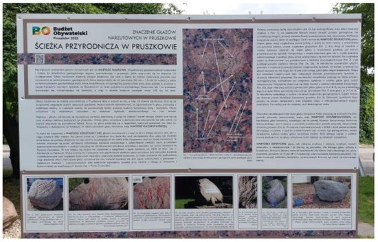 Hence, the initiative to protect erratic boulders should be recommended and popularised by locating the objects in one place and equipping them with boards and modern media employing smartphones and tablets, informing the public about the importance and role of geoheritage in the modern world’s functioning (e.g., [8,9,10,11,12,13,14,15]). Geointerpretation through storytelling [2,3,50] should not be omitted. Rock collections most often take the form of rock gardens or abiotic trails.