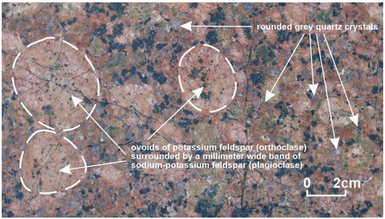 Frequently, the process of exfoliation (flaking) of a rock block can be observed on the surface of erratic boulders. The main factors of this process are temperature changes and the circulation of water and solutions in the micro-spaces between the minerals. They lead to the rock’s disintegration. This process is developing in the top parts of the Småland granite in front of the Museum of Ancient Mazovian Metallurgy (Figure 1) and also in the other Småland granite (Figure 7).