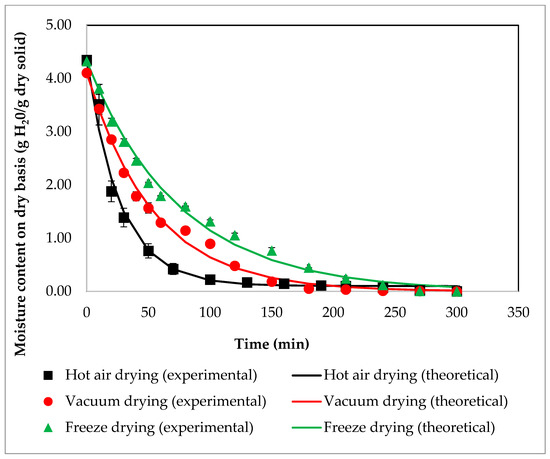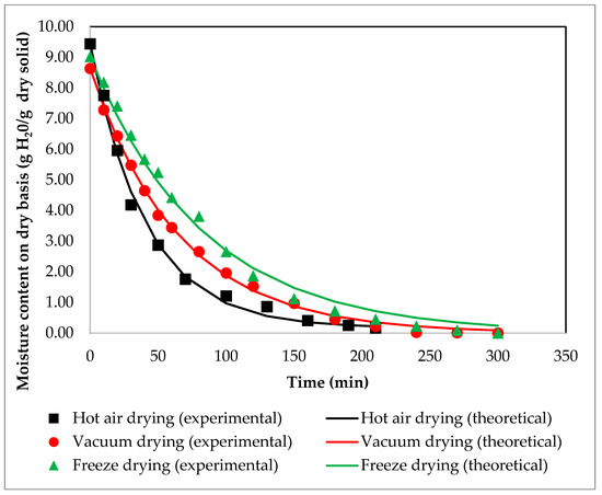 where X is the moisture content on a dry basis during drying ((Winit − Wfinal)/Winit) (g H2O/g dry solid), Xe is the equilibrium moisture of the dried sample (g H2O/g dry solid), k is the drying rate (min−1) and t is the drying time (min) [35].