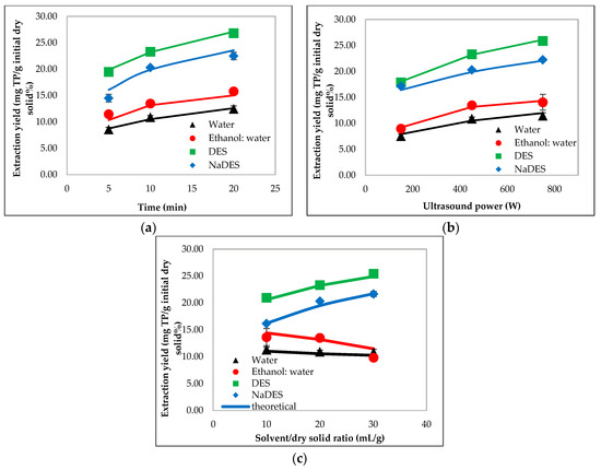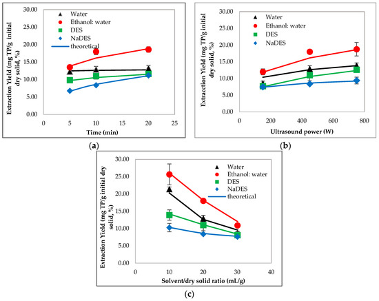 Correlation of the extraction yield, EY, (expressed in mg phenolic content/g dry initial solid, %) of peach pulp with the solvents of water, ethanol:water (8:2 v:v), deep eutectic solvent (choline chloride/urea):water (7:3) (DES) and natural deep eutectic solvent (choline chloride/lactic acid):water (7:3) (NaDES) with the factors of: (a) extraction time (min), (b) ultrasonic power (W) and (c) solvent/dry-solid ratio (mL/g).