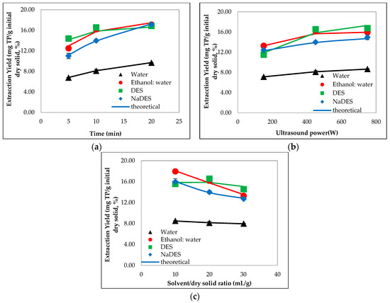 Correlation of the extraction yield, EY, (expressed in mg phenolic content/g dry initial solid, %) of apricot pulp with the solvents of water, ethanol:water (8:2 v:v), deep eutectic solvent (choline chloride/urea):water (7:3) (DES) and natural deep eutectic solvent (choline chloride/lactic acid):water (7:3) (NaDES) with the factors of: (a) time (min), (b) ultrasonic power (W) and (c) solvent/dry-solid ratio (mL/g).