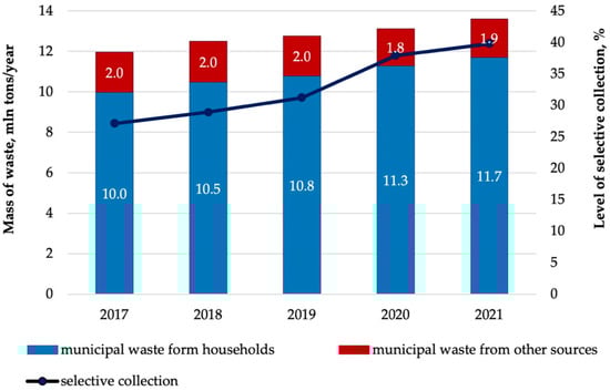 As shown in Figure 2, the mass of municipal waste generated in 2020 and 2021 did not differ from the values recorded for the previous years. In line with the trends observed in recent years, the mass of municipal waste generated in Poland in 2017–2021 has been gradually increasing, and households were the dominant source of municipal waste generation. The annual increase in the mass of municipal waste generated in 2017–2021 ranged from 0.3 to 0.5 million tons. In 2020 and 2021, during the COVID-19 pandemic, a decrease in the mass of municipal waste generated outside households was observed. The share of this waste in the total municipal waste stream was <14%, which was a lower result than in the previous years (15.5–16.7%). The mass of municipal waste from sources other than households generated by one inhabitant in 2020 and 2021 was 48 kg/year and 50 kg/year, respectively, which was a decrease of 2 to 5 kg in relation to the pre-pandemic years.