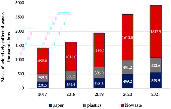 Mass of paper, plastics and biowaste collected selectively in Poland in 2017–2021, based on [24].