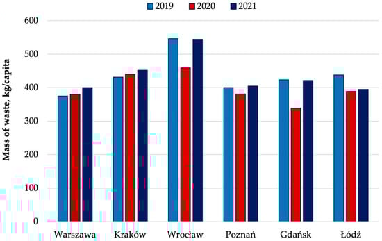 The nationwide increase in the mass of municipal waste generated during the pandemic, shown in Figure 2, is not the only indicator worth considering in the context of changes in the waste balance. In connection with the change in the mode of work and study in the country, internal migrations in the society were observed. This aspect mainly concerns academic cities and student communities, which in 2021 numbered over 1.2 million people [24]. For economic and social reasons, students returned to their family homes, which reduced the mass of municipal waste generated in academic cities. Changes in the mass of municipal waste generated per capita in the six largest academic cities in Poland in 2019–2021 are presented in Figure 4 (data for previous years are not available).