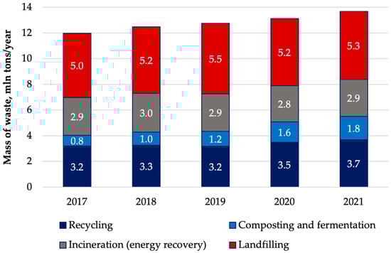 In Poland, the methods of processing and neutralizing municipal waste are classified into four categories: recycling, composting and fermentation, energy recovery through incineration, and landfilling (Figure 5). Since 2017, the largest amount of municipal waste in Poland has been landfilled (on average, approx. 40% of the generated municipal waste mass). Nevertheless, it should be noted that the amount of landfilled waste changes slightly over the years—in 2020 and 2021 (pandemic years), less than 39% of the mass of all generated municipal waste was landfilled. This means that despite the increase in the mass of waste, this waste was more often processed in other ways. Since 2017, there has been an increase in the mass of municipal waste recycled, composted, and fermented, even in the years closely related to the COVID-19 pandemic (2020–2021). Compared to 2019, in 2020, there was an increase in the mass of waste sent for recycling, including organic recycling, by 0.3 and 0.4 million tons, respectively. In those years, the increase in the amount of biowaste and other selectively collected waste (e.g., paper or plastics) could have been conditioned by the behaviour of system users during the pandemic (more frequent stays at home—stockpiling food, cooking meals; online shopping—packages in cardboard boxes). Due to the fact that they are managed through organic (biowaste) or material recycling (plastics, paper, etc.), a greater increase in the mass of municipal waste processed in this way in 2020–2021 compared to until 2019 was also noticed. In addition, the mass of municipal waste intended for energy recovery by incineration remains at a constant level (2.8–3.0 million tons/year). This is because of the fact that in Poland most municipal waste incineration plants were built in 2015–2018. Construction of new facilities is expected to start in the near future, but it is constantly opposed by Polish society, which reflects the mood of other European countries’ residents [28,29,30].