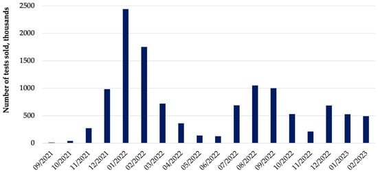 As the pandemic continued, in addition to the widespread use of personal protective equipment, disposable COVID-19 tests for self-testing at home or workplaces began to be used more often. Tests are available in pharmacies, supermarkets, and through online sales. The data contained in the PEX PharmaSequence reports present information on COVID test sales from about half of the pharmacies in Poland, i.e., from 6200 facilities. As shown in Figure 6, the highest test sale was observed in January 2022, when the largest wave of cases was recorded in Poland and worldwide. An increase in test sales can also be observed in December 2021 and 2022, i.e., in the pre-Christmas period, associated with frequent family visits and travelling. The number of tests sold in pharmacies during 18 months of the pandemic (from September 2021 to February 2023) amounted to over 12 million. Considering the fact that there are over 12,000 pharmacies in Poland, and the tests are also available in other facilities, the actual number of tests sold is several times higher.