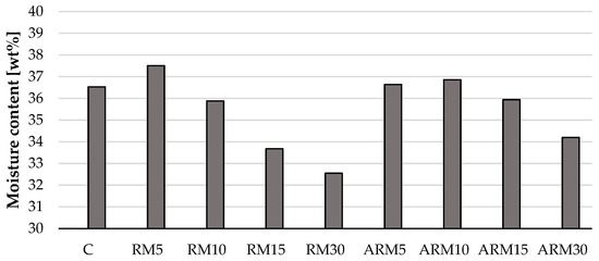 2-treated red mud in varying amounts changes in a similar trend. In both cases, as the amount of red mud added to the clay increased, the amount of water required for processing decreased. This fact is advantageous for possible industrial use, since during the drying step following shaping, a smaller amount of water needs to be removed from the mass, which can save energy.