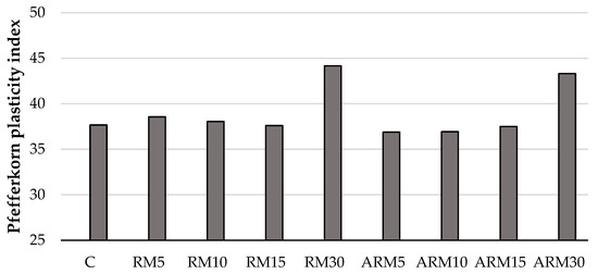 Figure 4) showed that the Pfefferkorn plasticity number hardly changed at lower amounts of different red muds, and its values were practically the same. However, at 30 wt% amounts of untreated and reduced alkalinity red mud, its value increased slightly, indicating that adding red mud in such amounts increases the plasticity of the ceramic wet mass. Considering these facts, adding red mud is advantageous from a manufacturing technological aspect, as plasticity can be increased even further, thus making it possible to produce more complex, hollow products.