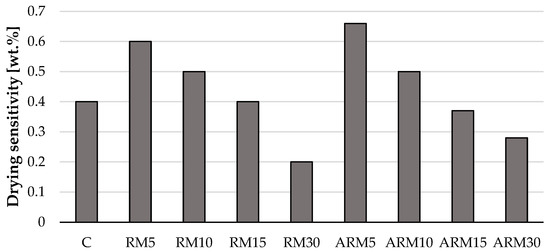 Figure 5 shows that all compositions were categorized as “not sensitive to drying”. It can also be observed that increasing the amount of red mud reduces the Macey drying sensitivity numbers, which is advantageous from a technological perspective, as the test specimens are less prone to cracking and have a lower chance of developing microcracks and pores in their internal structure.