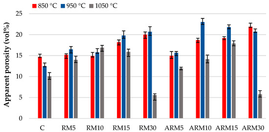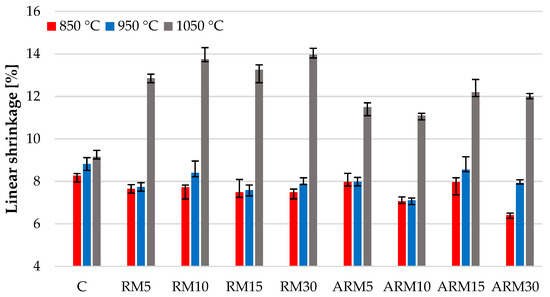 Figure 7, it is clearly visible that the increase in the content of red mud decreased the shrinkage of the test samples during firing at 850 °C and 950 °C compared to the additive-free clay. This is an advantageous property from a technological aspect, as it reduces the possibility of deformation and cracking. At 1050 °C, significant shrinkage was caused by the presence of large amounts of glassy (amorphous) phase (see