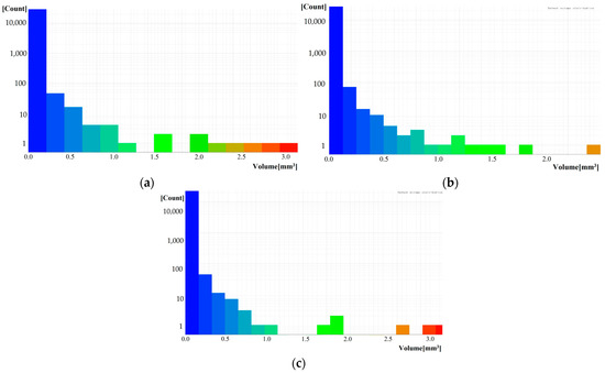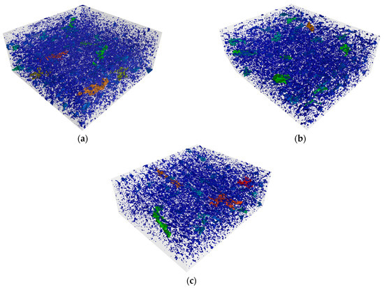 During the closed porosity analysis carried out with X-ray tomography, blocks of 50 mm × 50 mm × 30 mm were cut using VG Studio 3.4 software. According to the closed porosity analysis performed on the blocks, the closed porosity of bricks fired at 850 °C was 2.04 vol%, while for the sintered brick at 950 °C, it was 1.77 vol%. In the case of the heat-treated brick at 1050 °C with a 30 wt% of alkalinity red mud content, the measured porosity was 1.66 vol%. For RM30 samples, the closed porosity values were 3.43 vol%, 3.05 vol%, and 2.13 vol% during sintering at 850 °C, 950 °C, and 1050 °C, respectively. As observed in the open porosity measurement, the proportion of closed pores decreased with higher sintering temperatures, which is consistent with the melting processes occurring during heat treatment.