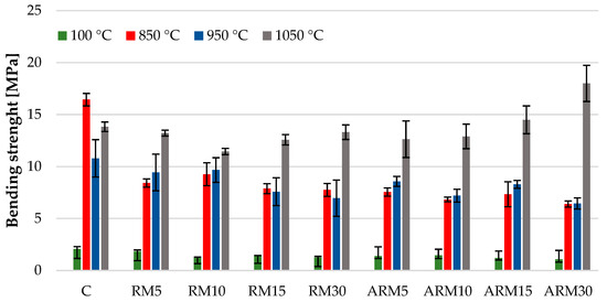 Figure 12 showing the change in flexural strength clearly indicates that the flexural strength of the clay samples with varying amounts of red mud content decreased by nearly half during firing at 850 °C and the bending strength of the samples fired at 950 °C also continuously decreased as the red mud content increased. The numerical values of the two samples fired at the lower temperatures were very similar, and considering the error margins in most cases, the values were practically identical. The highest strength values were measured in the case of bricks, which were sintered at 1050 °C. This fact can be explained by the strength-increasing effect of the amorphous/glassy phase that forms. However, it should be noted that according to X-ray diffraction analysis, the bricks fired at 950 °C (