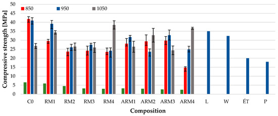 In the case of compressive strength, the dominant strength-increasing effect of firing at 1050 °C is less clear, but even in this case, most of the samples had higher strength values. It is worth mentioning the reference strength value as well: the compressive strength of classic small-sized (250 mm × 120 mm × 65 mm) solid bricks rarely exceeds a value of 35 MPa (according to the datasheet for Leier Ltd. (L), Devecser, Hungary). For small-sized solid bricks distributed by Wienerberger Ltd. (W) in Hungary (Budapest, Hungary), the standard compressive strength value is 32.4 MPa. Among other Hungarian brick factories, the manufacturer’s datasheet for small-sized solid wall bricks distributed by Északmagyar Téglaipari Ltd. (ÉT) (Serényfalva, Hungary) indicates a compressive strength value of 20 MPa, while Pápateszéri Téglagyár Ltd. (P) (Pápateszér, Hungary) specifies a strength value of 18 MPa.