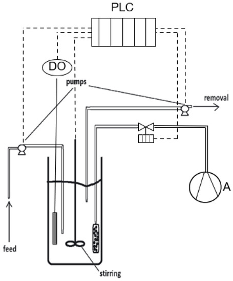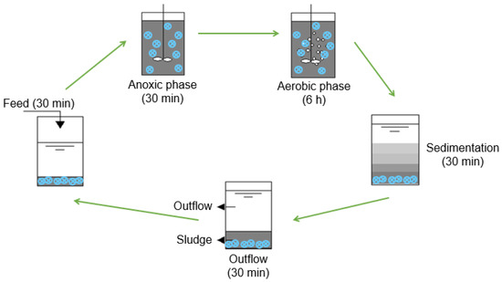 For the purposes of this research, an MBBR [2] with a total active volume of 2.5 L was used, which operated according to the philosophy of a sequencing batch reactor (SBR) [22], the successive phases of which are presented in Figure 1 and its flow diagram in Figure 2. The used bioreactor could also be called a sequencing batch-moving bed bioreactor (SB-MBBR), but for convenience it is referred to as an MBBR. Each operating cycle of the unit included the following phases: feed (30 min) with a Qin = 1.8 L/h, anoxic phase (30 min), aerobic phase (6 h), sedimentation (30 min), and outflow (30 min) with a Qοut = 1.8 L/h. The MBBRs consisted of a dissolved oxygen (DO) measuring sensor, 2 peristaltic pumps, an air compressor, a thermometer, and a PLC system (Eutech Instruments, Waltham, MA, USA), which was used for documenting and controlling the operation parameters with the help of SCADA software (Simantec, Siemens, Athens, Greece). The parameters documented and set via SCADA software included the concentration of dissolved oxygen in the tank, the temperature, inflow, and outflow, as well as the alternate operation stages of the unit. The temperature in the MBBR units was kept constant in the range 20–22 °C, since the units were located in an indoor air-conditioned laboratory facility.