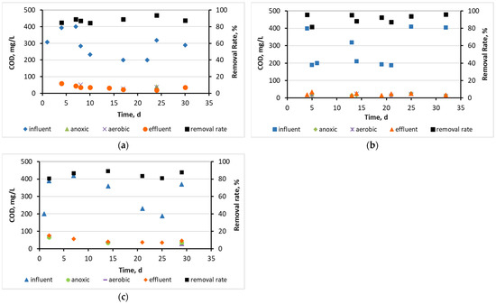 COD concentration diagrams for (a) control MBBR, (b) MBBR K1, and (c) MBBR 3D.