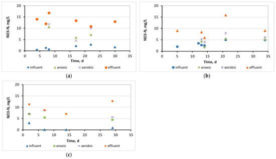 ΝO3-Ν concentration diagrams for (a) control MBBR, (b) MBBR K1, and (c) MBBR 3D.