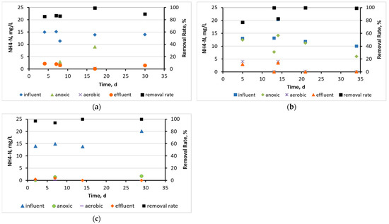 ΝH4-Ν concentration diagrams for (a) control MBBR, (b) MBBR K1, and (c) MBBR 3D.