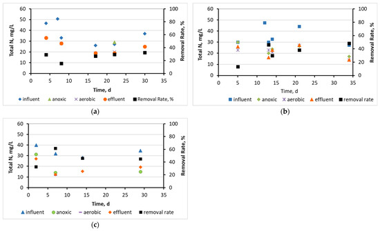 Total N concentration diagrams for (a) control MBBR, (b) MBBR K1, and (c) MBBR 3D.