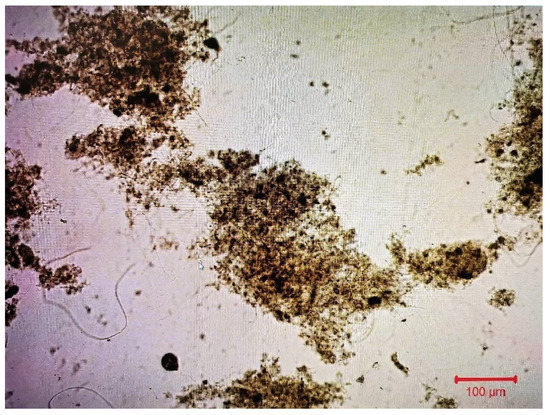 Figure 8 depicts a standard image of activated sludge taken from an optical microscope. In the anoxic phase, the aggregates’ size for the control MBBR was equal to 82 ± 20 μm, for MBBR K1 it was 72 ± 13 μm, and for MBBR 3D it was 174 ± 29 μm. The size of the aggregates seems to increase in relation to the operating time of the MBBR K1 and MBBR 3D units (Figure 9).