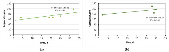 Size of the aggregates in the mixed liquor of the anoxic phase (a) for the MBBR Κ1 and (b) for the ΜΒΒR 3D experiments. Linear regression line is included in the graphs.