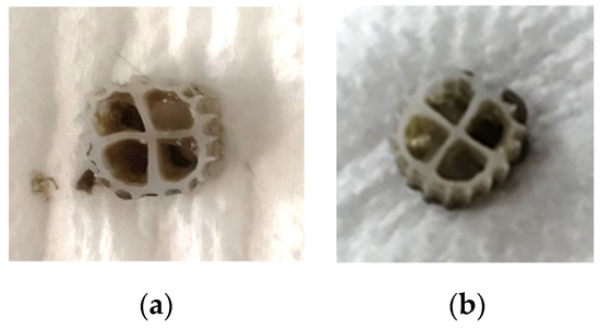 As shown in Figure 10, biofilm is clearly produced not only inside the biocarriers of MBBR K1, but also on the trabecular surfaces of the biocarriers’ walls. On the 14th day of the unit operation, it was observed that biofilm was created inside three out of the four quadrants of the biocarrier as well as on its trabecular surfaces. On the 29th day of the unit operation, biofilm was created in all four quadrants of the biocarrier.