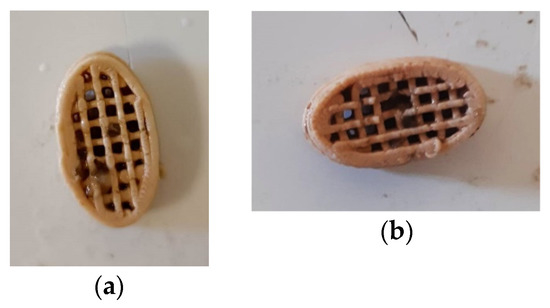 In the following figure, Figure 11, the biocarriers and the biofilm that was developed on the inside of their surfaces in relation to time are presented. The dry mass of the biofilm in relation to the operating time of the unit is presented in Table 5. The measurements in this case also regarded the biofilm that was developed on the surfaces of five biocarriers after its extraction. The SMP protein values in the biofilm of 3D-printed biocarriers were 17 ± 3.4 mg/L and the SMP carbohydrate values were 2.8 ± 2.5 mg/L.