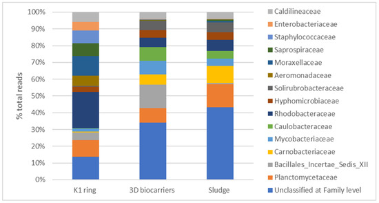 Relative abundance of the major families detected on the biofilm of K1 ring, 3D-printed biocarriers, and sludge at 30 days of operation.