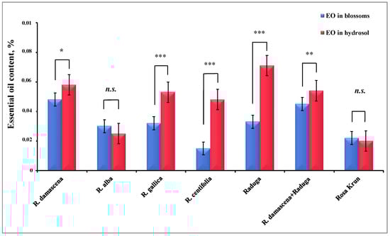 Comparative analysis of the essential oil content in the blossoms and hydrosols of the investigated roses. Quantitative features are the mean of three independent measurements. The values are presented in percentages. A significant statistical difference in the oil content of blossoms versus hydrolates is presented as follows: *—p < 0.05; **—p < 0.01; ***—p < 0.001. n.s.—No significance.